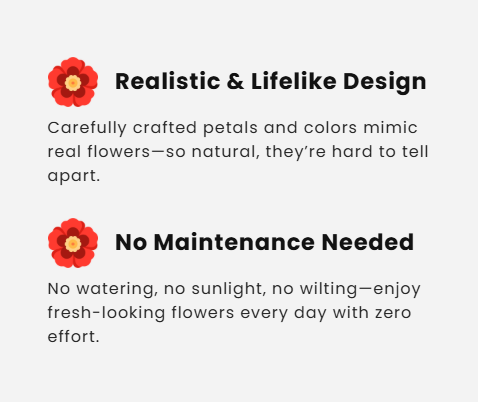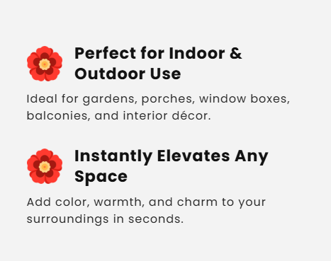 These ultra-realistic artificial flowers are designed to look fresh all year round, instantly transforming your home, garden, or balcony into a blooming paradise.