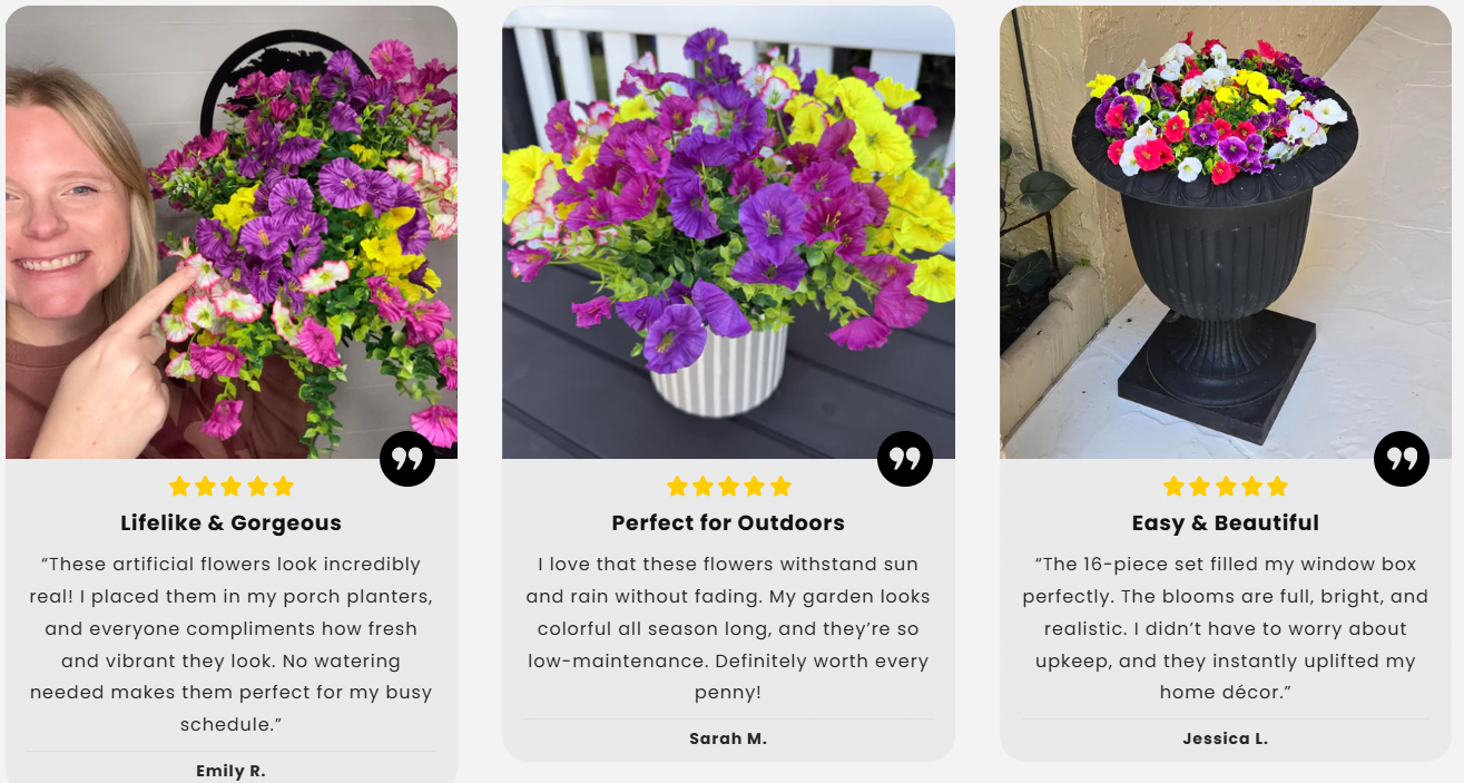 Ever planted beautiful petunias, only to watch them wilt in the sun, die in the rain, or get eaten by pests? 😫 Or spent hours watering, pruning, and deadheading—just to have your porch look sad and bare by mid-summer? These Artificial Outdoor Petunias are here to fix your garden woes: they’re lifelike, UV-resistant, and zero-maintenance, so you get the vibrant, full-bloom look of real flowers—without the work, the waste, or the heartbreak.