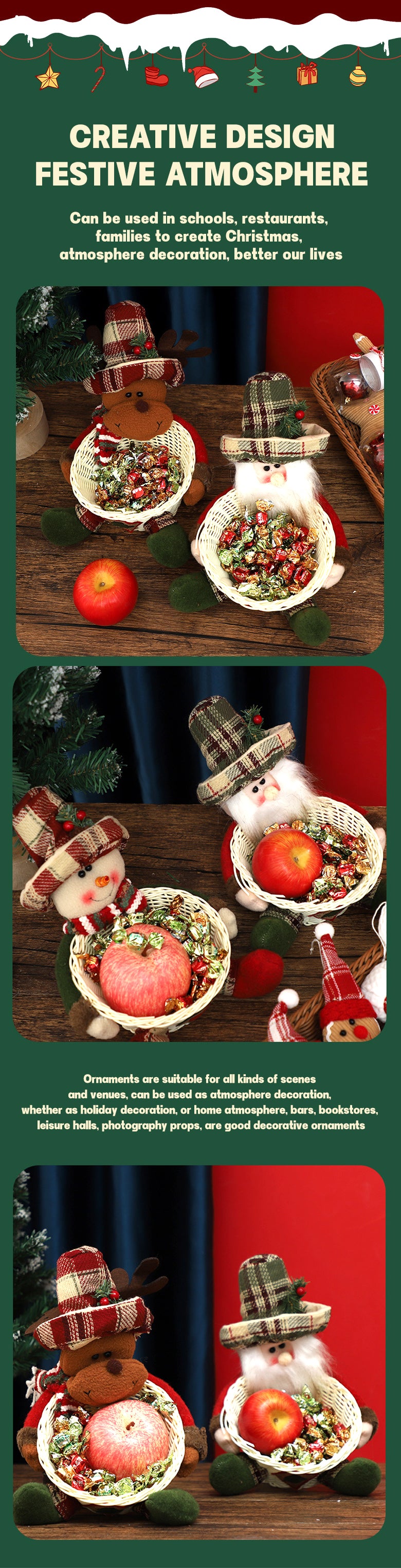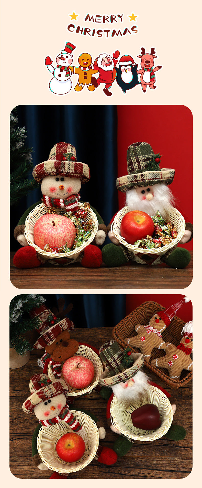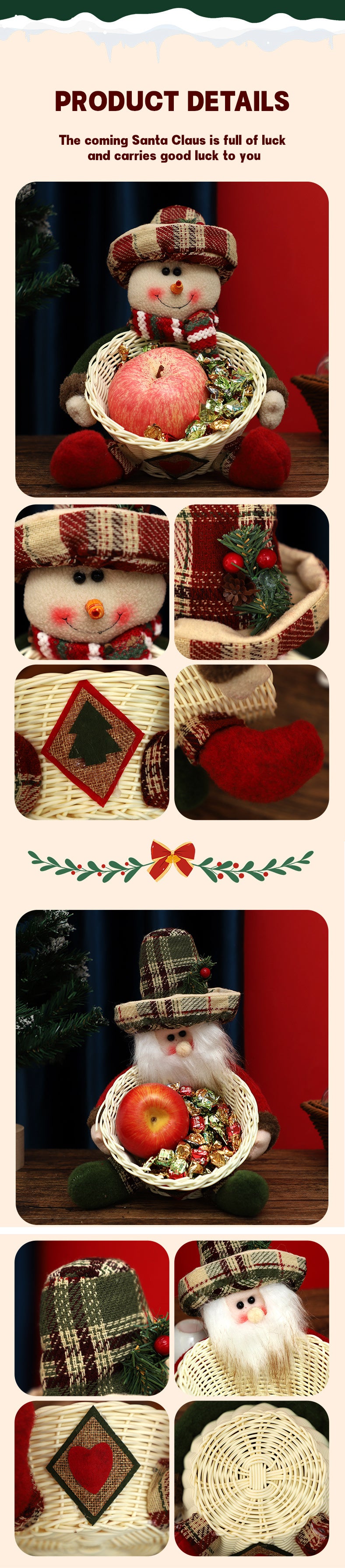 Our new Christmas Candy Basket Decoration is perfect for your festive decorations! This beautiful tabletop ornament is not only beautiful, but also adds a strong festive atmosphere to your home, making every corner filled with warm Christmas atmosphere.