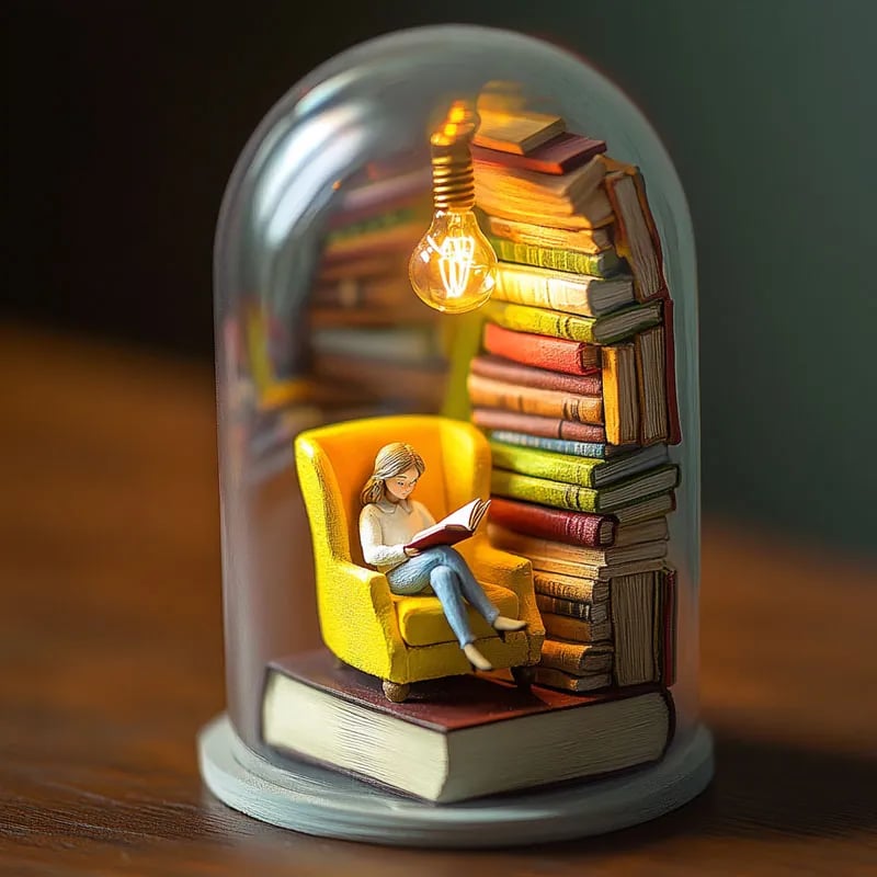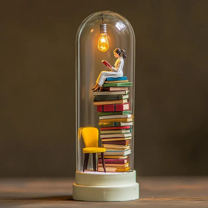 āØAbove the figure, a small LED light gently illuminates the scene, casting a soft glow that enhances the peaceful atmosphere of the reading environment.